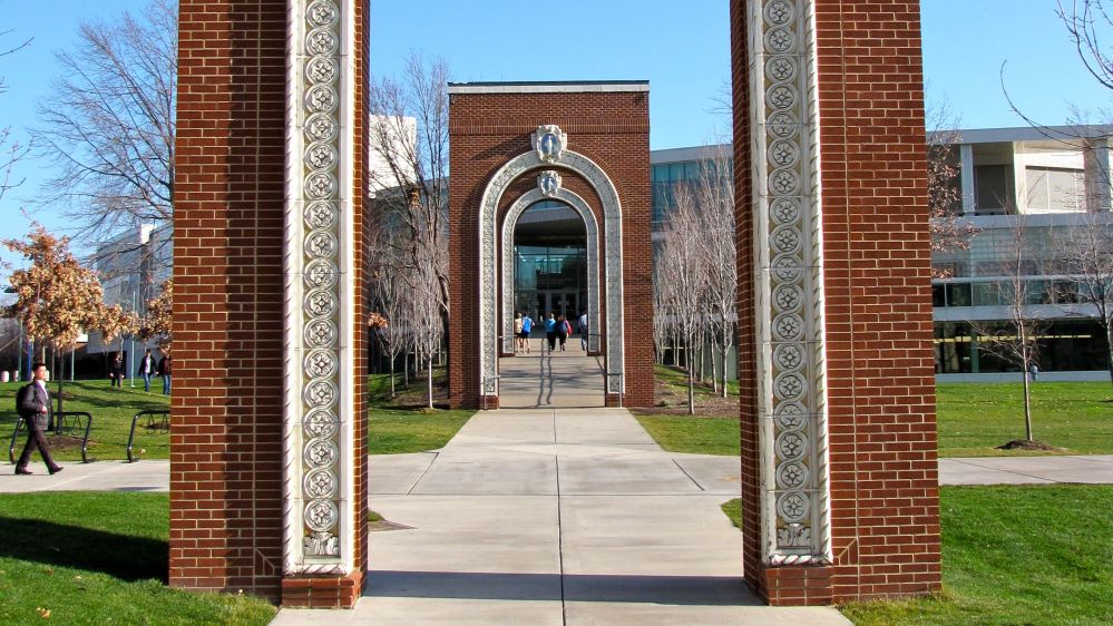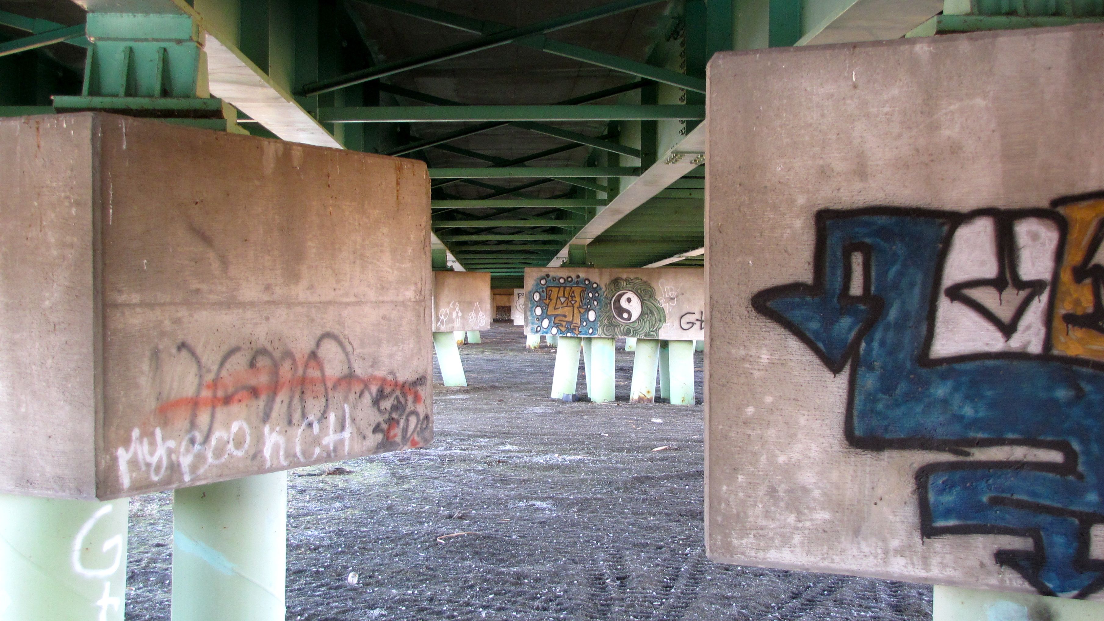 Greg and I did a little exploring around Akron this afternoon. First, we headed to The University of Akron campus to check out the new football stadium. All the while we were tailed by the Goodyear blimp, constantly monitoring our movements. Later we hiked one of the new portions of the Towpath Trail at Summit Lake. A portion of the trail actually floats above the lake. This hike was a lesson in urban graffiti. I guess I was somewhat comforted by the peace sign…