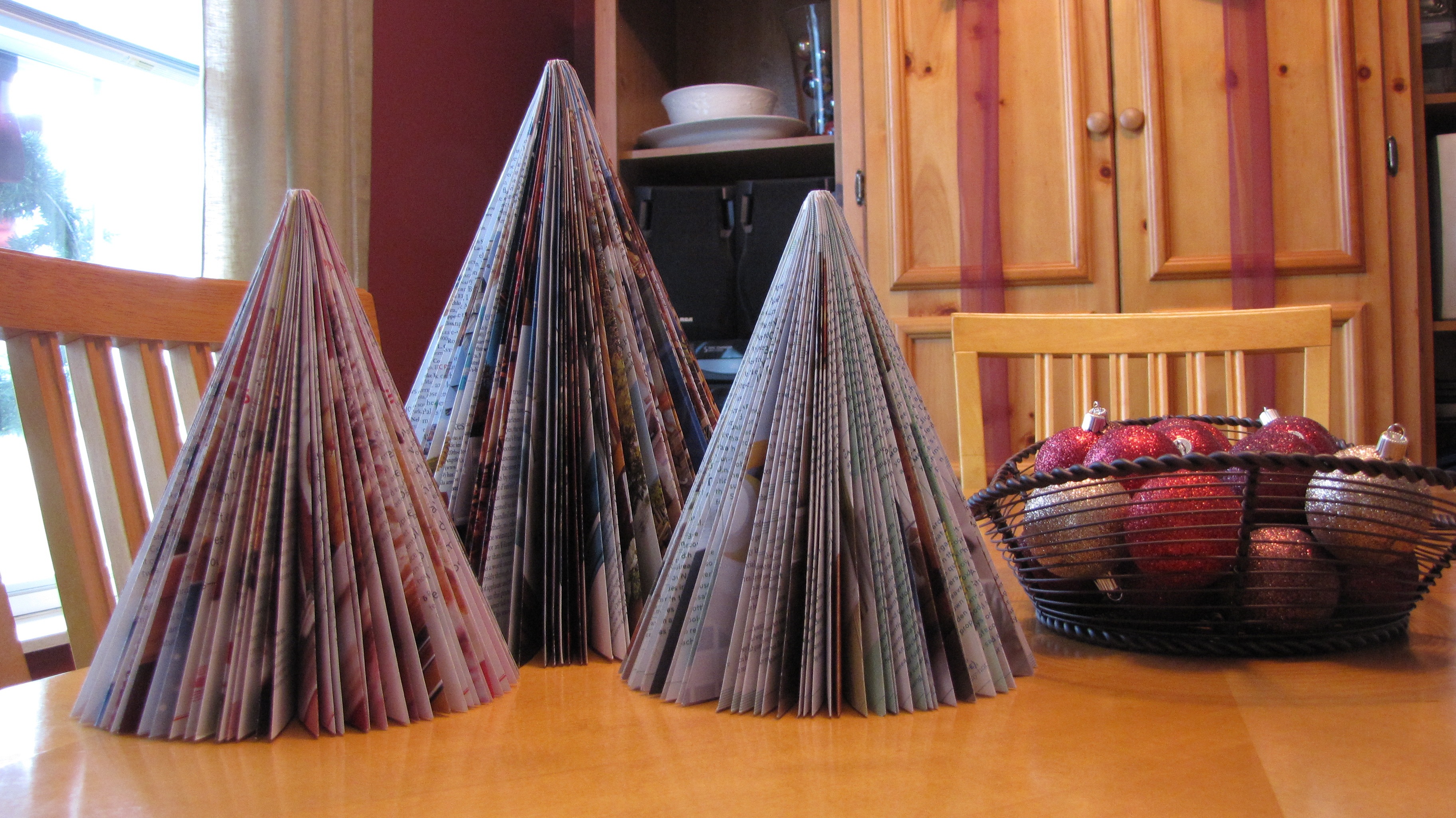 Last night I was catching up on some Martha Stewart shows from last week. On one of them Martha and one of her company crafters demonstrated the magazine Christmas tree. I was smitten. Some of you might now that I have a bit of a magazine obsession, so there were plenty around to turn into trees. Martha also spray paints and glitters the trees. I’m thinking that I might just keep mine in their natural state. There’s enough glittered decor in our house right now. Here’s a link where you can find the simple instructions on how to create your very own trees. All you need are magazines and an urge to fold lots and lots of sheets of paper.