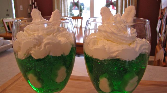 No, not that #2. The #2 on my list of 37 things to do in the year before I turn 38. Today, I made lime jello! As I was thinking today about jello, my thoughts went back to my Grandmother Derr, or Grammie as all the grandkids called her. It seemed like all the family dinners at her place included a jello dish of some sort. And usually the jello had some sort of surprise in it. Grated carrots (a bad surprise in my book) or fruit cocktail or marshmallows (both wonderful surprises). While at the grocery this morning, I stumbled upon marshmallows in the shape of tiny snowmen. Just perfect to be nestled in my lime jello concoctions. I also decided to top the Cool Whipped mountains with a couple of the guys too. So this post is for you Grammie. I miss you so much.