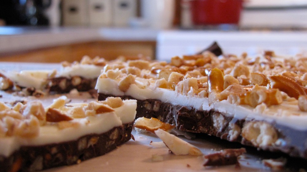 I saw this recipe for Toffee Pretzel Bark a few weeks back on Brown Eyed Baker. One of the many food blogs that I obsess over. I mean come on, salty and sweet? And you had me at the two types of chocolate. So simple to make. Just melt, spread, crunch, cool and repeat. I made them yesterday to take to Michele’s for a cook out. They were pretty well liked. My only change to the recipe was to add a tad more white chocolate. It’s my favorite, and I wanted a nice thick layer of it on top.