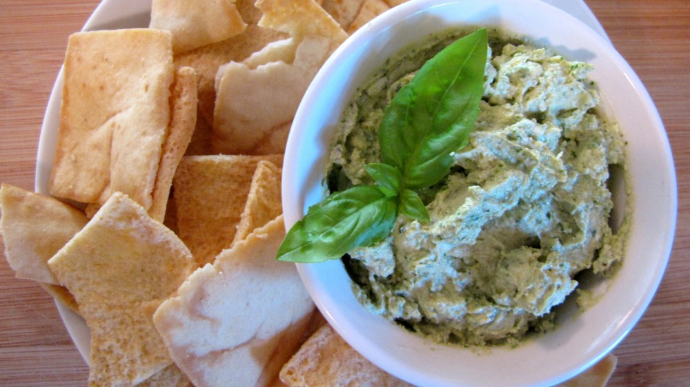 In the bowl of an electric stand mixer add a 4 ounce log of your favorite goat cheese, 1/4 cup of homemade pesto, and a teaspoon of fresh lemon juice. Beat for several minutes until all the ingredients are well combined. Serve with pita chips.