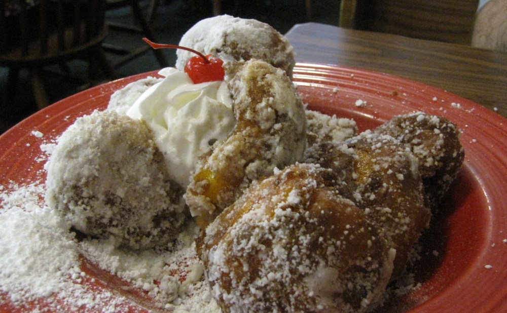 The restaurant was small and decorated in a charming 50’s motif. We were seated at table 12, a.k.a., the Marilyn booth. We knew that we going to get an order of fritters, we just weren’t sure which flavor. The very kind waitress steered us towards the peach. But of course, peaches were in season, and we were not disappointed. For just $7.95 we got a piping hot plate of ten good-sized, homemade fritters generously dusted with powdered sugar and topped with a dollop of whipped cream and a single cherry. A small tear formed in the corner of my left eye as it was presented to our table.
