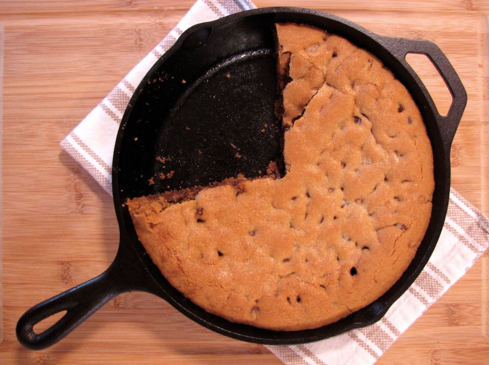 You see after tasting a slice of  Martha Stewart’s Cookie of the Day, the Skillet-Baked Chocolate-Chip Cookie, Greg asked that I not take any to work. And I had to agree…this was too good to share. Particularly when it was still a little warm from the oven. I cursed the fact we had no vanilla ice cream to top it off. While the recipe calls for a cup and a half of chocolate morsels, I swapped out a half cup of them for caramel bits that I found at the store the other week. They added a lovely additional flavor and texture to the giant cookie. I was also a little scared of over baking the cookie.  Once the top looked cooked and golden, about 40 minutes, I took it out of the oven to cool. That left us with a slightly under baked interior that we enjoyed quite a bit. As it cooled it became quite chewy and wonderful.