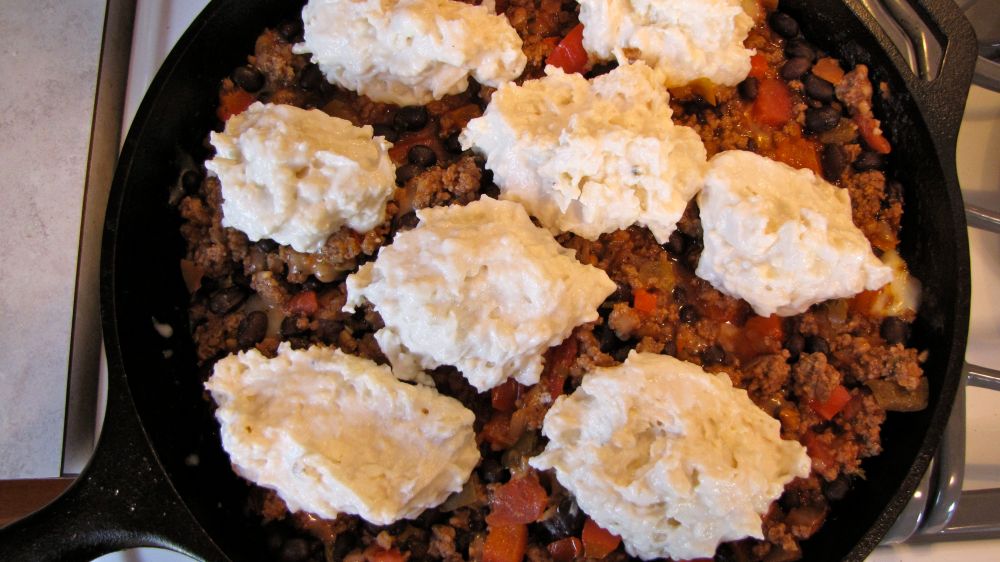 The filling was easy enough to put together. Simply brown a pound of lean ground beef, add to that a chopped red bell pepper, garlic, a can of black beans and a jar of chunky mild salsa. Heat it through, make a very simply biscuit topping, and then throw it in a hot 450 degree oven for about 25 minutes.