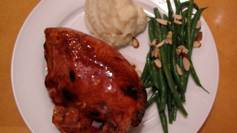 While the chicken breasts are baking in the oven, you glaze with the sauce about every five minutes. The final result is a very moist chicken with a crisp flavorful skin. I reserved about half of the sauce to serve on the side with chicken. I know that I’ll be making this pomegranate glaze again. I think that it might make an excellent glaze on broiled salmon.