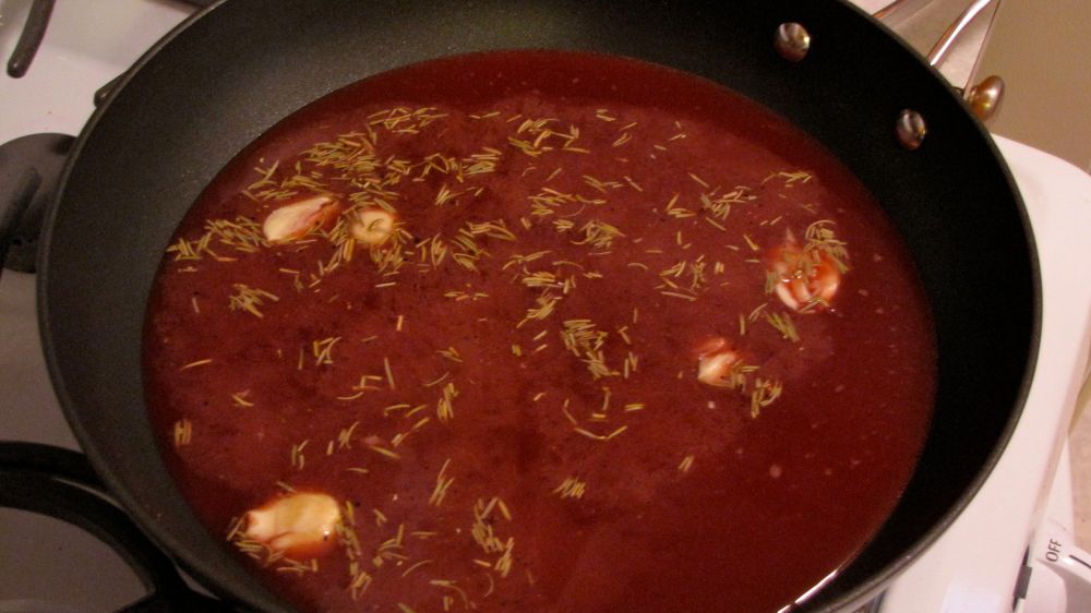 About a month or so ago, I received an email from POM Wonderful, asking if I’d like to sample their 100% pomegranate juice. At the same time I remembered that Everyday Food magazine had featured this amazing juice back in its December 2006 issue in the “Have You Tried?” section. That’s were I found the recipe for Pomegranate-Glazed Chicken. I served the chicken for our 10th anniversary dinner last night. The chicken was amazing, but the real star of the dish was that deliciously sweet and tart glaze. T0 make the glaze I reduced two cups of pomegranate juice and one cup of orange juice with 3 smashed cloves of garlic, a teaspoon of dried rosemary and a pinch each of salt and pepper. It takes a little over 15 minutes on high heat to reduce to about half a cup. After straining the reduced glaze you add two teaspoons of red-wine vinegar.