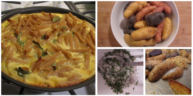 It all started when I was at the grocery store and came across a big bag of multi-colored perfect little fingerling potatoes. There’s just something about them, that I can’t resist. Particularly the purple ones. After a bit of research, I found that Martha had a very simple recipe for Roasted Fingerling Potatoes with Seasoned Salt. My partner Greg was particularly enamored with these roasted potatoes. I wanted some baked eggy-goodness to go with the fingerlings. A few moments later after searching for frittata recipes, I was sold on the Penne Frittata with Basil and Ricotta. Thankfully, our grocery store had some pretty great looking basil in the middle of January. And really, how can you go wrong with eggs, pasta, basil and cheese?