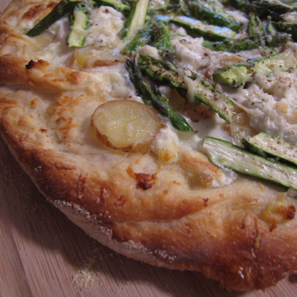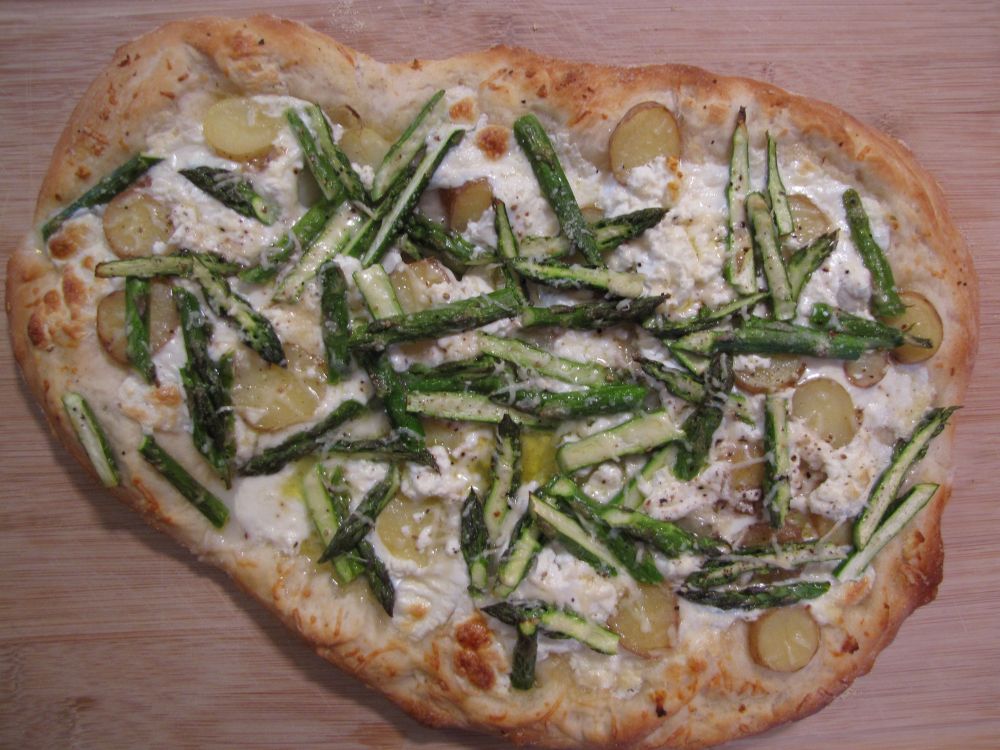 Pizza. What can I say? It’s one of my favorites. And it’s all the better when you make it home. As I wrote about a few days ago, I’m working my way through a big bag of fingerling potatoes. As a result, I’ve been pouring over recipes that include these delightful mini spuds. While surfing the Epicurious iPad app I came across a recipe for Asparagus, Fingerling Potato and Goat Cheese Pizza from the May 2009 issue of Bon Appetit magazine. There was no resisting the charm of this pizza. I’m lazy and refuse to make my own pizza dough. I hear it’s easy enough, but it takes time and I’m a pretty impatient fella. I used the frozen pizza dough that you can find in your grocer’s frozen section and thawed it the night before in the fridge. Now for the toppings. There was a lot of cheese, not just the goat cheese from the title. There was also fresh mozzarella just above the garlic-oiled crust. And to finish off the top layers of potatoes and asparagus, a generous sprinkling of parmesan. If you’re looking for a rustic and filling pizza, this is your guy.