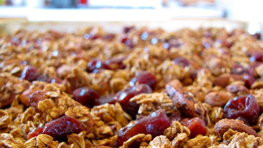 Instead of the melted butter and sugar combination found in most granola recipes, this version uses apple juice and molasses. The apple juice adds a great unexpected flavor and aroma to the granola.