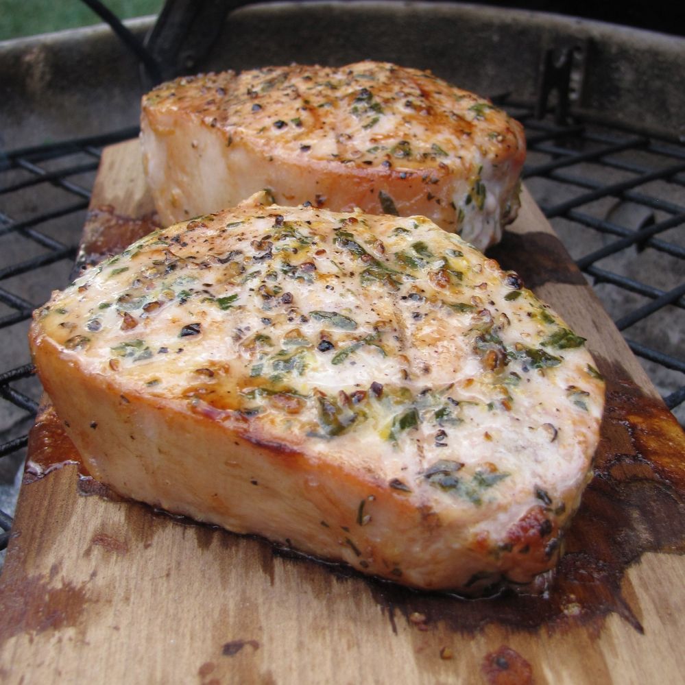 Cover the grill and cook until an instant-read thermometer inserted into the center of the chops registers 145 degrees, 15-20 minutes (mine took about 10 minutes more). To create grill marks on the chops, transfer them from the plank directly to the grill grates and cook for 1 minute more, per side.