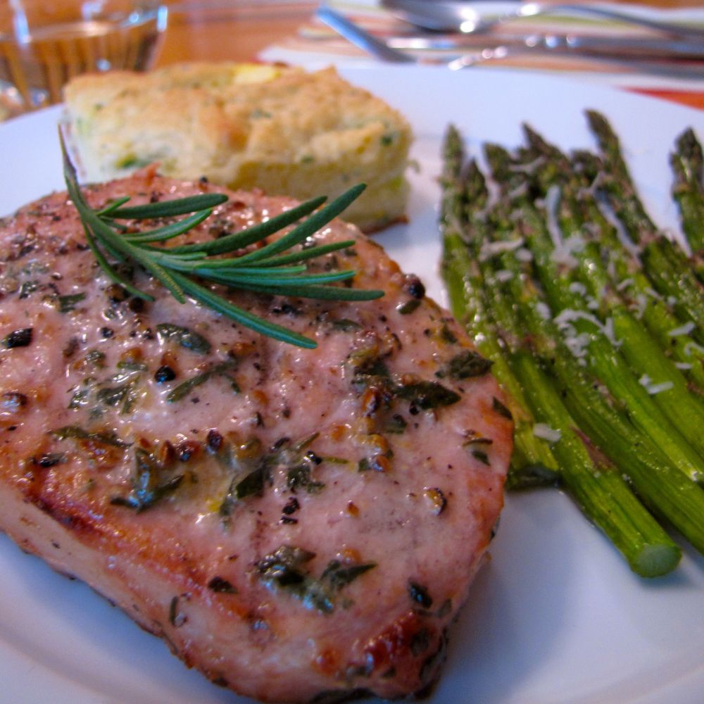 In a small bowl, combine the chopped rosemary, olive oil, lemon juice and zest. Place the pork chops in a baking dish or resealable plastic bag and pour the marinade over the chops, coating them evenly. Cover the dish with plastic wrap or seal the bag and refrigerate for at least 1 hour or up to 4 hours.