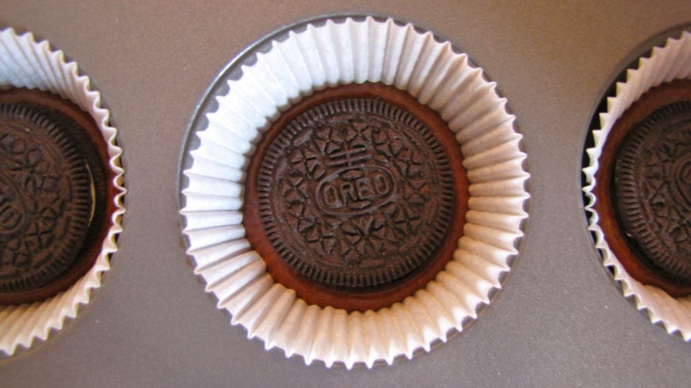 Spoon 1 tablespoon of batter into each muffin cup and top with one cookie. Top the cookie with 1 tablespoon of batter. Bake until cupcakes are puffed and set, 15 minutes, rotating pans halfway through. Let cupcakes cool completely on a wire rack.