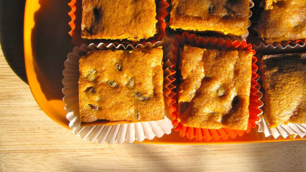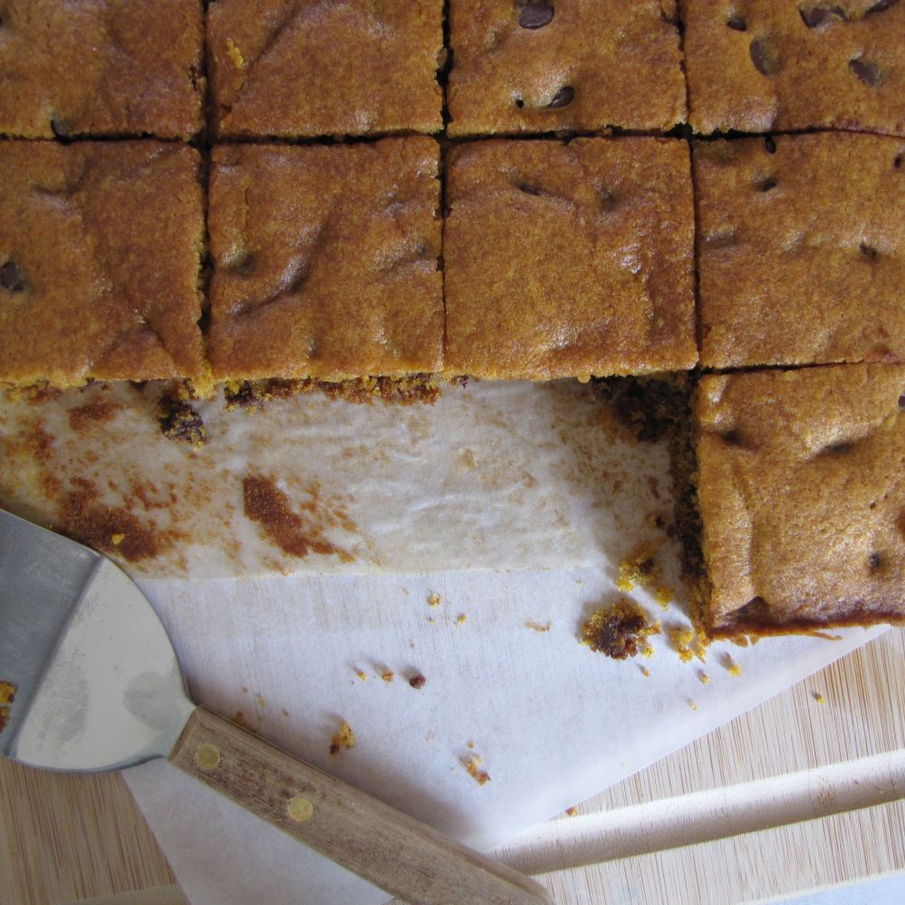 Today, I cracked open another can and made these terrific Pumpkin & Chocolate-Chip Squares. They are a breeze to make. Everything was mixed and spread in the baking pan in less than 15 minutes. The longest chunk of time was the baking process, 35-40 minutes. That gave me plenty of time to clean up the kitchen. A few weeks ago I really “Cammed the kitchen” (Modern Family reference). I’ve pledged to never let that happen again. We’re still finding mounds of flying frosting scattered around the kitchen.