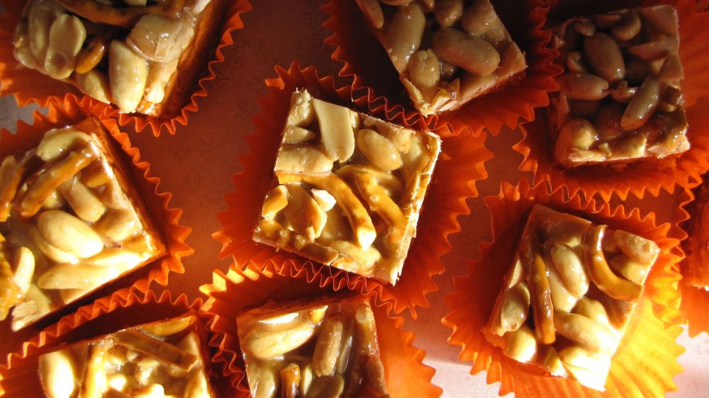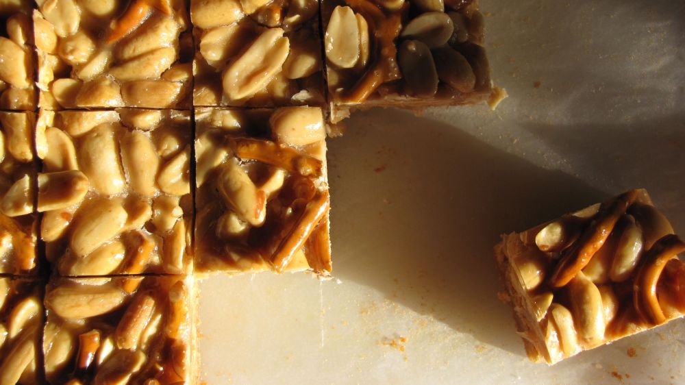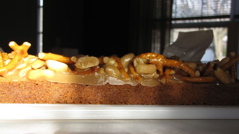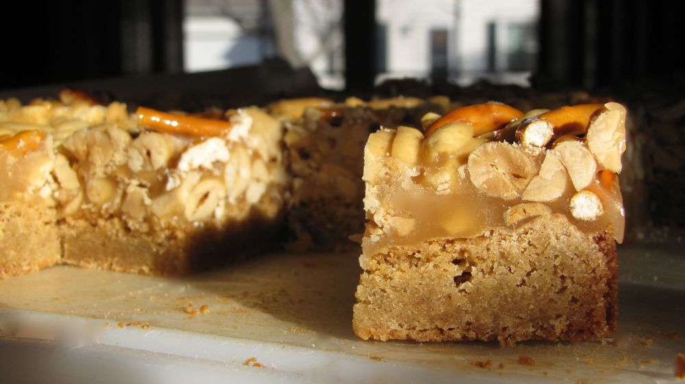 So here’s what you get with the final product, a rich dense blondie foundation with a topping of peanuts and pretzels coated in homemade chewy caramel deliciousness.