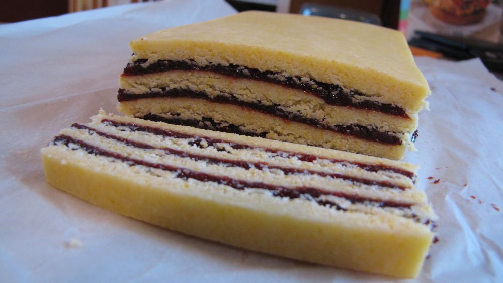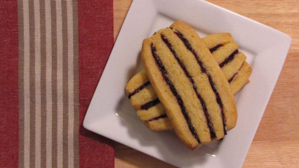 But let me tell you, I’m glad that I soldiered through with these cookies. They taste wonderful. The three tart and chewy cherry stripes counter well with the crisp sweetness of the corn meal cookie layers. A word of advice, don’t cheap-out on the cherry preserves. Those flavorful stripes are the stars of this cookie. On my father’s recommendation, I picked up a jar of Bonne Maman Cherry Preserves. They are from France and well worth the nearly $5 a jar price tag.